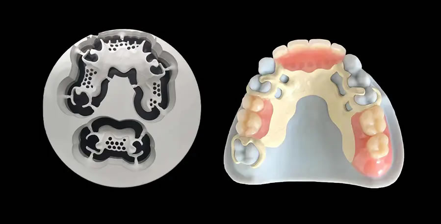 铸造钢托可摘义齿在以上三种之中相对体积最小、最坚固、最舒适,因为它的基托是铸造出来的,既薄又坚固,因为是用铸造工艺制作的,所以能在可摘义齿上添加牙周夹板、防嵌器、予留网等装置(可根据患者口腔情况选择添加设计),是目前比较理想的一种可摘义齿。